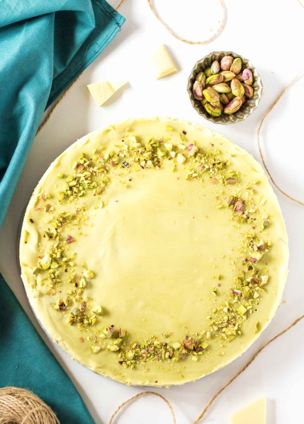 Preprosta sirova torta s pistacijami, pistacijevo pasto, sladko smetano in maskarponejem