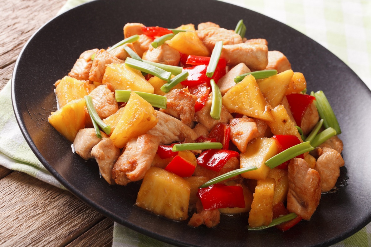 Premešamo, da nastane gosta omaka, potem v ponev vrnemo meso, dodamo kocke ananasa, znova premešamo, da omaka obda meso in nekoliko povre, na koncu pa v jed vmešamo še papriko in čisto na koncu koščke zelene.