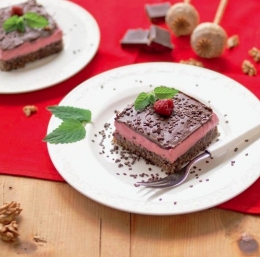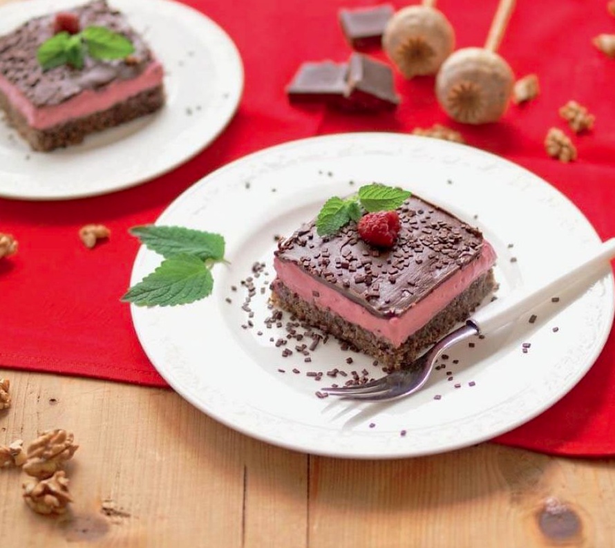 Ohlajeno biskvitno podlago namažemo z marelično marmelado in nanjo porazdelimo pripravljeno kremo. Sladico pokrijemo in postavimo v hladilnik za 3 ure, lahko tudi čez noč, da se krema strdi. Strjeno kremo prevlečemo s čokoladno glazuro, ki jo pripravimo tako, da čokolado nad vodno kopeljo stopimo s kokosovo mastjo. Ko se glazura strdi, sladico narežemo na kocke in jo okrasimo s čokoladnimi mrvicami in svežimi malinami.