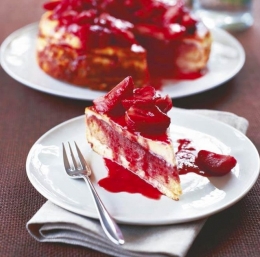 Medtem pripravimo omako tako, da sladkor zmešamo z 1 dl vode in nežno segrevamo, da se raztopi. Dodamo očiščene in na večje rezine narezane jagode in kuhamo 3 minute, da se tekočina obarva rožnato in se jagode rahlo zmehčajo. Polovico jagod s penovko poberemo iz tekočine, preostalo polovico pa ohladimo v tekočini. Ohlajene nato pretlačimo skozi cedilo in tako dobljeno omako premešamo s celimi jagodami. Torto prelijemo z jagodno omako, po želji dodamo še žlico kisle smetane in postrežemo.