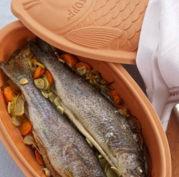 Lonec pokrijemo s pokrovom in vse skupaj pečemo v prej ogreti pečici, najprej 25 minut pri 120 °C, potem pa nadaljnjih 25 minut pri 180 °C. Postrvi serviramo z zelenjavo na krožnike in takoj ponudimo.