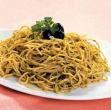 V veliki posodi zavremo vodo, v kateri skuhamo špagete al dente. Špagete odcedimo, jih vrnemo v ponev, dodamo maslo in na srednje močnem ognju pretresemo. Dodamo omako in z dvema vilicama premešamo. Ponev odstavimo in špagete razporedimo na krožnike in okrasimo s črnimi olivami.