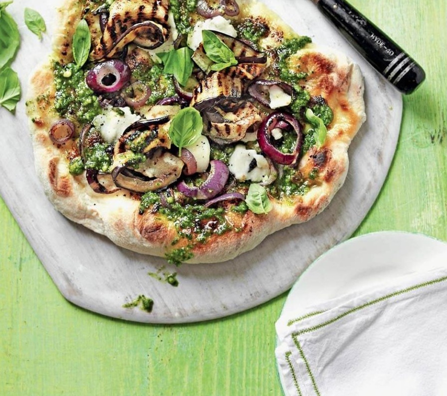 Pečeno stran pic premažemo s pestom. Obložimo z jajčevci, čebulo in kozjim sirom, nalomljenim na koščke. Če nam je všeč pekoče, dodamo še zdrobljen čili. Pokrito (če nimamo pokritega žara, pico lahko pokrijemo z aluminijasto folijo) pečemo na žaru, dokler se sir ne stopi. Posujemo z bazilikinimi listi in postrežemo.