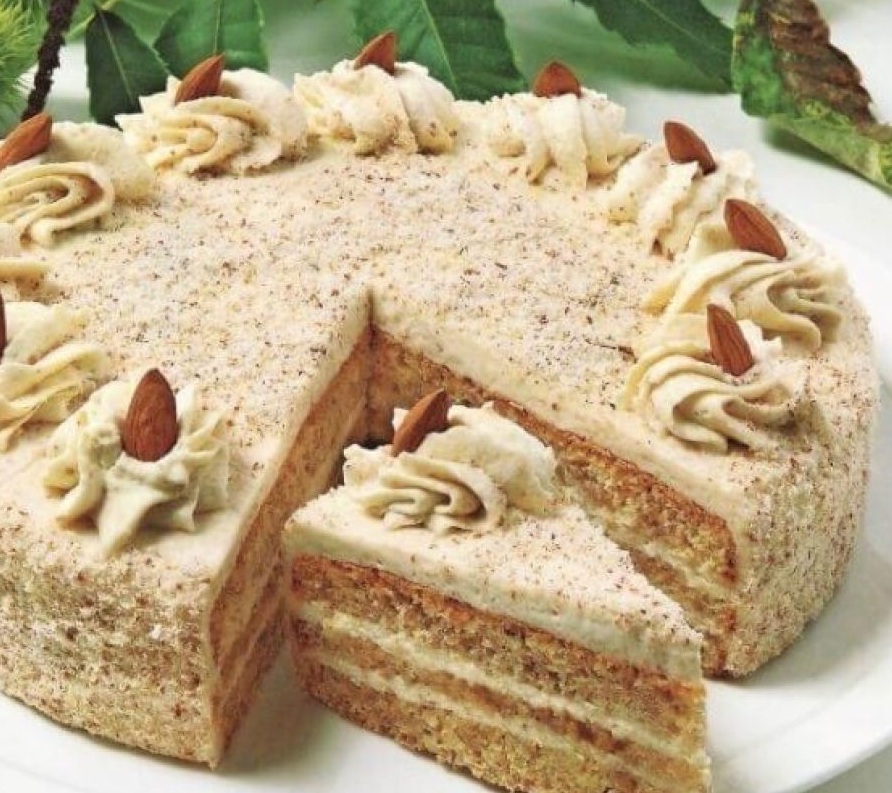Dve tretjini kreme namažemo na tortne oblate in jih sestavimo. Malo kreme napolnimo v brizgalno vrečko z zvezdastim nastavkom. S preostalo kremo gladko premažemo površino in obod torte ter potresemo z zmletimi mandlji. Na površino torte nabrizgamo rozete in okrasimo z mandljevimi jedrci. Torto postavimo za dve uri v hladilnik. Dobro ohlajeno kostanjevo torto razrežemo z nožem, ki smo ga potopili v vročo vodo.