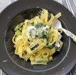 Medtem ko se testenine kuhajo, pripravimo omako. V veliki kozici na srednji temperaturi segrejemo olje in maslo. Na njem pražimo drobno sesekljano čebulo 5 minut, da se začne mehčati, nato dodamo drobno sesekljan česen, temperaturo znižamo in pražimo še 5 minut. Solimo in popramo, nato dodamo jušno osnovo in približno 450 g graha. Zavremo in kuhamo 1 minuto, nato ugasnemo kuhalnik. Mešanico predenemo v multipraktik, dodamo crème fraîche ali kislo smetano, meto in baziliko ter zmeljemo v gladko omako.
