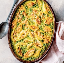 Omako nalijemo v velik plitev pekač. V skledico damo nekoliko razkosano tunino, limonovo lupinico in sok, drobno sesekljano šalotko, kis, sladkor, ščep soli in crème fraîche ali kislo smetano ter dobro zmešamo. Školjke napolnimo z maso in jih položimo v grahovo omako. Posujemo jih s preostalim grahom in sirom grana padano. Pečemo jih 20 minut, da se sir zlato rjavo obarva, nato postrežemo.