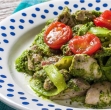 Kumaro vzdolžno razpolovimo in diagonalno narežemo na tanke rezine. Oprano in posušeno solato ter kumaro razporedimo na krožnike in pokapljamo s poljubno polivko. Na solato položimo ribje fileje in jih obložimo z žličko pesta iz oreškov makadamija.
