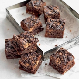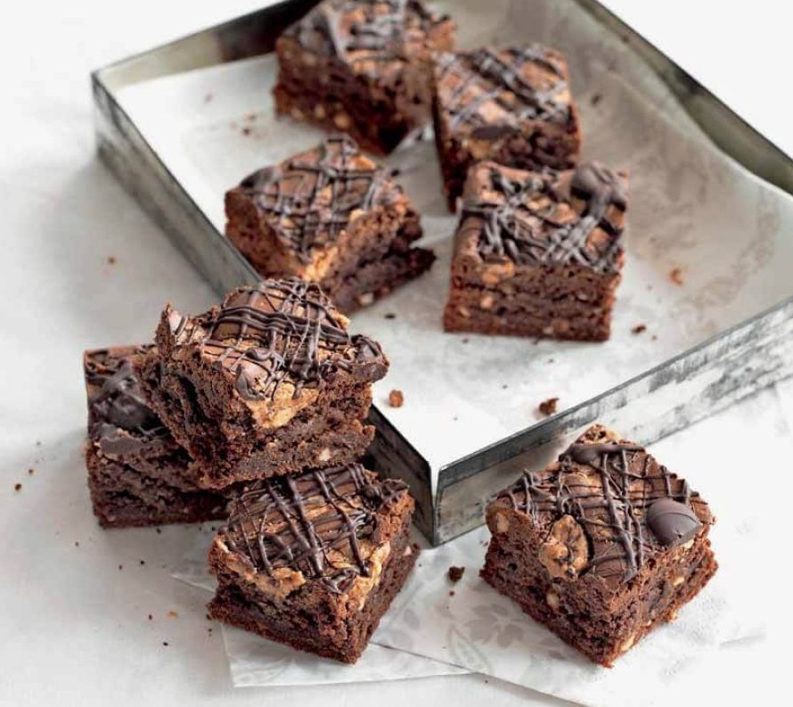 Raztopimo še preostalo čokolado in z njo okrasimo rjavčke. Slaščico popolnoma ohladimo v pekaču, nato pa razrežemo na kvadratke.