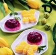 1 zavitek praška za rdeč puding (npr. gozdni sadeži, jagode ...) 1 zavitek praška za rumen puding (npr. vanilja, breskev-marelica ...) 2 dl rumenega sadnega soka (npr. pomaranča, marelica, breskev ...) 2 dl rdečega sadnega soka (npr. jagode, rdeči sadeži ...) 4 dl mleka sladkor po okusu
