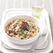 8 dl piščančje, ribje ali zelenjavne jušne osnove 400 g dimljene vahnje (lahko tudi postrvi, skuše, brancina ali orade) 30 g masla 1 por sol in poper 250 g ješprenja 1 dl suhega vermuta ali drugega suhega belega vina 100 g mlade špinače 2 žlici drobno sesekljanega peteršilja 3 žlice sladke smetane (po želji) 30 g naribane starane gaude ali edamca za posip (po želji)