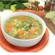Por operemo, očistimo in narežemo na kolobarje. V veliki kozici na nizki temperaturi razpustimo maslo in dodamo por. Solimo in popramo ter dodamo približno 2 žlici vode, kozico pokrijemo in dušimo približno 10 minut, da se por zmehča. Primešamo ješprenj, ga 1 minuto mešamo, nato temperaturo malo povečamo in dodamo vermut ali vino. Pustimo, da skoraj v celoti povre, nato dodamo polovico prihranjene jušne osnove.