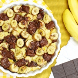 V skledi stepemo jajca, primešamo moko in sladkor, nato še mleko. Med kruhove kocke damo banane, na vrh pa na koščke nalomljeno čokolado. Nato vse enakomerno prelijemo z jajčno zmesjo, pekač postavimo v ogreto pečico in pečemo približno 25 minut.