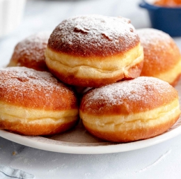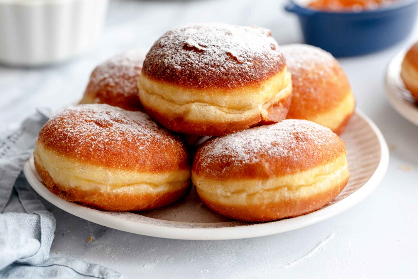 1 kg bele moke, 5 dkg kvasa, 10 dkg sladkorja, 7 dkg masla, 8 rumenjakov, 1 dl kisle smetane, 2 žlici ruma, 0,5 l mleka, sol, vanilijev sladkor, malo limonine lupinice marelično marmelado, mleti sladkor za posip, olje za cvrenje.
