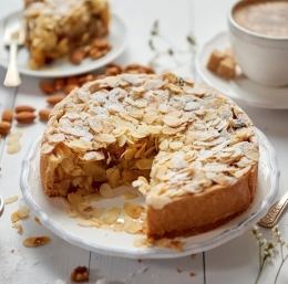Torta je narejena iz mandljeve moke, zato je naravno brez glutena in primerna tudi za tiste z intoleranco ali celiakijo. Mandljevi lističi na vrhu poskrbijo za prijetno hrustljavost, medtem ko notranjost ostane mehka in sočna.
