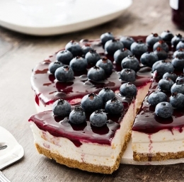 200 g piškotov (npr. petit beurre), 80 g masla, 500 g grškega jogurta, 200 ml sladke smetane, 80 g sladkorja v prahu, želatina v lističih (5 lističev), jagodičje za okras.