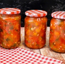 2 kg paradižnikov pol kg bučk pol kg paprike pol kg korenja ena in pol glavica česna 1 šopek peteršilja po želji (1 feferon) 50 g soli 120 g sladkorja 100 ml olja 60 ml alkoholnega kisa 9%