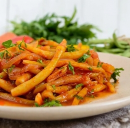 Turški stročji fižol, znan tudi kot zeytinyağlı taze fasulye, je priljubljena vegetarijanska jed, ki se kar topi v ustih. Kuhamo ga počasi v olivnem olju, skupaj s paradižnikom, čebulo in česnom, da ustvarimo jed, ki pooseblja okuse poletja.