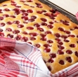 Sestavite pecivo. V pekač vlijte pripravljeno zmes in jo enakomerno razporedite. Z žlico nanesite ohlajen puding v manjših kupčkih po površini – ni ga treba popolnoma zmešati z maso. Rahlo ga pomokajte, da med peko ne potone. Na koncu dodajte višnje in jih enakomerno razporedite po vrhu.Pecite. Pecite 45–50 minut, dokler pecivo ne dobi zlatorjave barve. Po peki ga pokrijte s kuhinjsko krpo in pustite, da se ohladi. Postrezite. Ohlajeno pecivo potresite s sladkorjem v prahu. Najbolj okusno je, ko se sestavine lepo povežejo in puding rahlo vpije v biskvit. Video recept