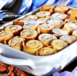 Vzhajano testo pregnetite in pustite nekaj minut počivati. Razvaljajte ga v pravokotnik, premažite z nadevom in enakomerno potresite rozine. Zvijte v tesen zvitek, prestavite v pomaščen pekač, premažite z jajcem ter z iglo prebodite na več mestih.