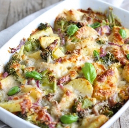 Krompir je eno izmed najbolj hvaležnih živili. Nasiti, lepo se poda k skoraj vsem sestavinam in nas popelje v pravo domačnost. Ko ga združimo še z brokolijem, rdečo čebulo in dobro pestjo sirov, dobimo kombinacijo, ki je hkrati hranljiva, barvita in polna okusa. Vonj, ki se med peko širi iz pečice, napolni kuhinjo z domačnostjo, na krožniku pa čaka hrustl skorjica in mehka, sočna notranjost.