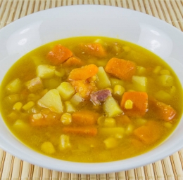800g Buča 2 kosa Krompir 1 kos Čebula 2 stroka Česen 125g Slanina 1 žlica Maslo 250g Koruza - pločevinka 2 kosa Lovorov list Sol Poper