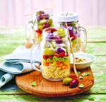 V steklene kozarce s pokrovom z navojem zložimo v plasteh testenine, koščke paprike, por, feferone in olive. Prelijemo s prelivom in zapremo s pokrovom. Pred jedjo kozarec dobro pretresemo.