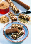 Maso oblikujemo v kroglico in postavimo za pol ure v hladilnik. Potem jo razvaljamo v pravokotnik, dolg 30 cm in širok 12 cm. Narežemo 12 rezin in jih povaljamo v preostalih kosmičih.