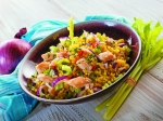 250 g riža, žafranika v prahu, 400 g piščančjega fileja, 1 vejica rožmarina, 2 stroka česna, 3 stebla stebelne zelene, 1 čebula, 1 čili, olje, sol, poper