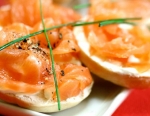 Žemljice prerežite na pol. Vsako polovico obložite s pripravljenim namazom in rezino dimljenega lososa. Potresite z drobnjakom in postrezite.