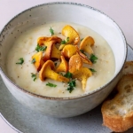 500-550 g lisičk 120 g čebule 3 srednje debeli krompirji 2 srednje velika korenčka 1 steblo belušne zelene 30 g masla 0,6 dl sladke smetane, 36–40 % 6 dl zelenjavne osnove sol črni poper v zrnu 1/2 žličke naribanega muškatnega oreščka 1/2 žličke prekajene mlete rdeče paprike 1 žlica sesekljanega peteršilja 2 stroka česna 2 vejici rožmarina