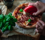 6. Pico zdaj obložimo po želji. Mi smo za domačo mezgo zmiksali pelate, česen, baziliko, posolili, poprali in oplemenitili z balzamičnim kisom. Nato smo se lotili nadeva capricciosa: dodali smo gobice (te popražimo, da nam pozneje na pici ne pustijo poplave, saj domače pečice niso dovolj močne, da bi lahko izparela vsa tekočina), vložene artičoke, kuhan pršut in mocarelo. Ne zamerite nam, pozabili smo na črne oljke. Vi jih le dodajte!