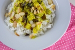 V ponvi brez maščobe prepražimo cele, olupljene mandlje in jih primešamo k omaki.