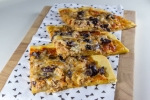 Testo razvaljamo. Premažemo ga s paradižnikovo omako in obložimo s tunino, olivami in ovčjim sirom.