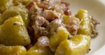 Njoke po kraško pripravimo tako, da najprej na olivnem olju popražimo pršut, dodamo česen, bešamel, črne olive, sesekljan peteršilj, smetano, sol in poper.