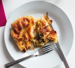 Prelijte z jajčno zmesjo, premažite z oljčnim oljem in na drobno naribajte sir. Pecite 40 minut ali dokler ne dobi zlate in hrustljave skorje.