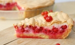 4 Čvrsto beljakovo testo namažemo čez testo ter posujemo z ribezom ali pa ribez nežno umešamo v nadev, ki se bo zato obarval rožnato, nanesemo na testo in poravnamo.