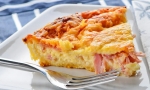 4 Preko testa naložimo 1/3 pripravljenega nadeva in pokrijemo s polovico šunke. Postopek ponovimo in jed na koncu prelijemo s preostalim nadevom, posujemo s sirom in slanino.