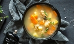 3 Kuhane ribe poberemo iz juhe in jim odstranimo vse kosti. Juho precedimo in vanjo stresemo prepraženo čebulo s paradižnikom.