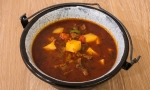 400 g govedine 400 g divjačine ( divji prašič, srna) 400 g svinjine 1,2 kg čebule 1,2 kg krompirja 6 strokov česna 1/2 žličke majarona in timijana 2 lovorova lista 1,5 dl belega vina 1,5 dl rdečega vina 0,5 l jušne osnove sol in poper 1 žlica mlete paprike 1/2 žličke pekoče paprike 2 žlici svinjske masti