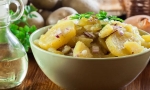 2 Medtem čebulo olupimo in drobno nasekljamo, v manjšo ponev damo sol, poper in kis in mešanico segrejemo. Čebulo potresemo po krompirju in zalijemo s toplim kisom. Premešamo, pokrijemo in pustimo pol ure, da se kis lepo vpije v krompir.