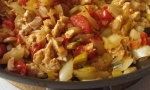 1 Meso narežemo na manjše koščke in ga prepražimo na oljčnem olju. Ko postane rumene barve, ga vzamemo iz ponve in na istem olju prepražimo sesekljane čebulo, papriko, paradižnike, peteršilj – vse z nekaj zrni popra. Pozneje jih lahko vzamete ven.
