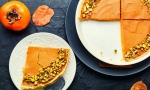 400 g bučnega pireja 250 g kakijev 3 jajca 130 g sladkorja 200 ml sladke smetane ščepec soli cimet po okusu 150 g nesoljenih pistacij (ali bučnih semen ali drugih oreščkov)