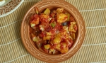 1 Čebuli sesekljamo z zelenimi deli vred, v večji ponvi jo popražimo na oljčnem olju. Malo jo posolimo, da se hitreje zmehča. Papriko in paradižnik narežemo na majhne koščke. Dodamo k čebuli in dušimo toliko časa, da izhlapi vsa voda, ki jo spusti zelen.