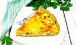 700 g buče 150 g slanine 2 jajci 2 dl sladke smetane 100 g naribanega sira – edamec 60 g sveže naribanega parmezana 1 šopek svežega peteršilja ali/in timijana 3 žlice oljčnega olja sol in poper