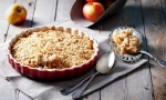 300 g moke 1 ščepec soli 175 g rjavega sladkorja 200 g hladnega masla 700 g naribanih jabolk 50 g sladkorja za jabolka 1 žlica moke za jabolka 1 žlička mletega cimeta 3 žlice masla za pekač