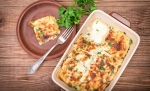 3 Pečico segrejemo na 190°C. V vročo bešamelovo omako vmešamo polovico naribanega sira in gorčico. V velik pekač za narastek izmenjaje polagamo mešanico s piščancem, lazanjo in sirovo omako, zadnja plast naj bo sirova omaka. Jed pečemo 1 uro, da se zlato rjavo obarva. 5 minut pred koncem potresemo s sesekljanim peteršiljem.