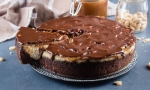 Naredimo karamelno plast. Sladkor stopimo (ne mešamo s kuhalnico), prilijemo sladko smetano, pokuhamo, da se zgosti in na koncu vmešamo maslo in ščepec soli. V karamelo vmešamo neslane arašide in jo razporedimo po torti. Tukaj si lahko pogledate bolj podroben postopek za karamelo.
