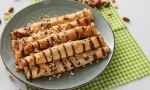 Vsako palačinko namažemo z orehovim nadevom po celi površini, le pri enem robu pustimo malo prostora. Zavijamo proti robu, ki ga nismo namazali.