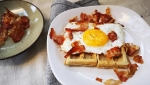 V ponvi na nizki temperaturi popečemo slanino iz obeh strani. 4 jajca v ponvi na maslu spečemo in pazimo, da se rumenjak ne razlije.
