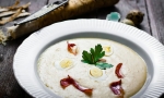 2 žlici masla 1 žlica olja 4-5 žlic moke 1 liter vode ali jušne osnove 1 liter mleka 2-3 žlice hrena (svežega) 1 jajce rezine slanine ali pancete 1-2 dcl smetane za kuhanje sol, peteršilj